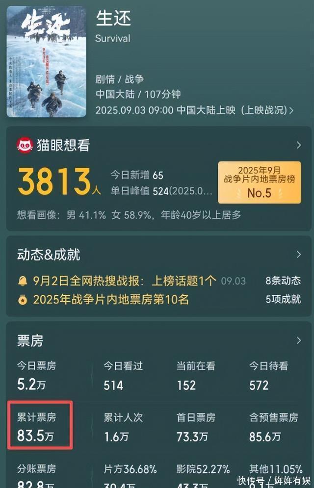 万万没思到,还有“妙手”—— 《生还》票房当下总票房果然才83万,片方分账也惟有30万 。