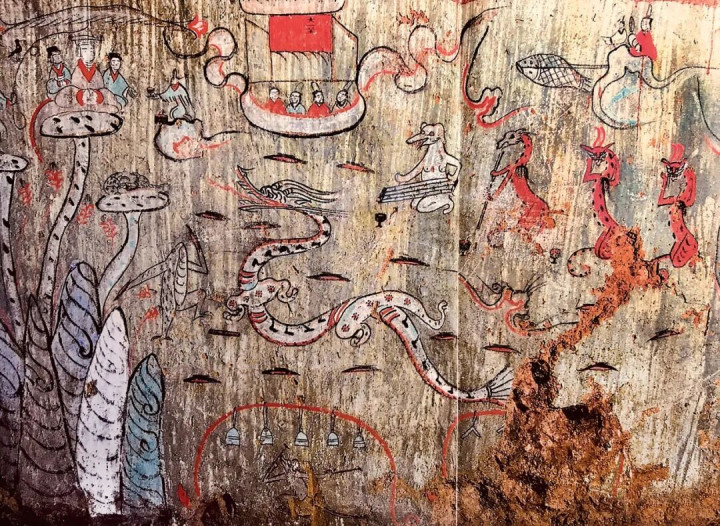 陕西郝滩汉墓壁画《访问西王母乐舞图》,提供了一种更具放纵色调的昆仑图式,画面左侧的昆仑山,是由高耸的群山和灵芝草构成的,山岭上有弧线的海浪纹,山石之间发出三朵灵芝,姿态轻盈秀雅。灵芝是传奇中的仙药,《神农本草经》以为“久食轻身不老,延年忠良”,故而灵芝充任了仙山的符号,汉画像中也有访佛的构图。正中央的灵芝顶部冠盖上,危坐着西王母,傍边各有一个侍女。而在壁画的右边,则把更大的空间留给了龙、蟾蜍等多样异兽,它们在弹琴、敲钟、吹箫、击饱读,异兽们鸾歌凤舞的体魄节律,使画面充满了酣畅的脑怒,空中还有仙东谈主驾着云朵飞来。这标明昆仑山是联想中的乐土,墓室的主东谈主但愿身后能插足联想中的仙界乐土。