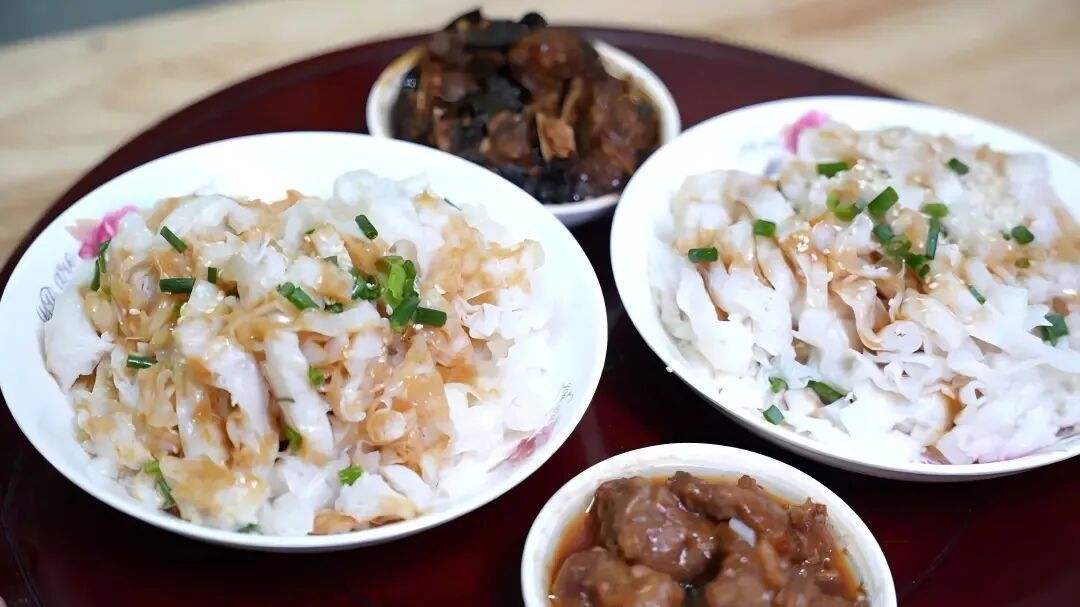 江谷窝粉,是四会东谈主关于大米的私有创造。它由米浆制成,将米浆浇在窝篮上,提起窝篮转上两圈,将其平铺开来再放入蒸炉里快速蒸熟。吃时先将窝粉晾凉、切碎,搭配牛腩、排骨、花生油、酱油等调料悉数食用,米香味浓郁、爽口弹牙的江谷窝粉一刹就能打动你的味蕾。