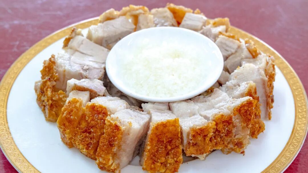 四会地豆镇的烧肉遐迩著名,用柴炭烧制,皮脆肉嫩,档次光显。咬下去会发出咔嚓声的芝麻皮,透亮的肥层进口即化,肉软多汁不起渣,甘香而不腻。