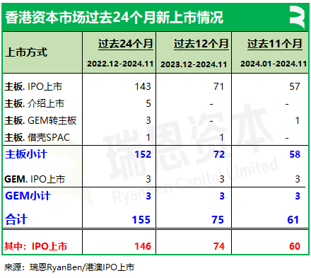在往日的24个月(2022年12月至2024年11月)香港新上市公司155家,主板上市152家(包括:143家IPO上市、5家先容上市、1家借壳SPAC、3家GEM转主板),GEM(创业板)上市 3家;