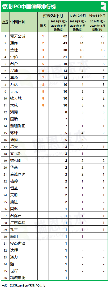 就本年前11个月的数据来看,这36间中国讼师中的27间,参与57家(触及到中国业务或财富)新上市。