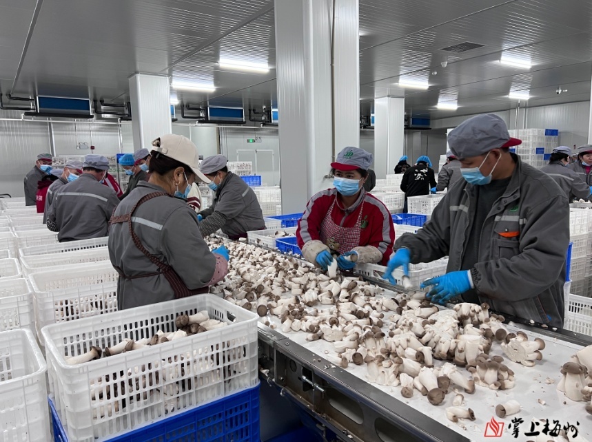 代米食物的制品包装车间里,工东谈主们在挑选杏鲍菇。