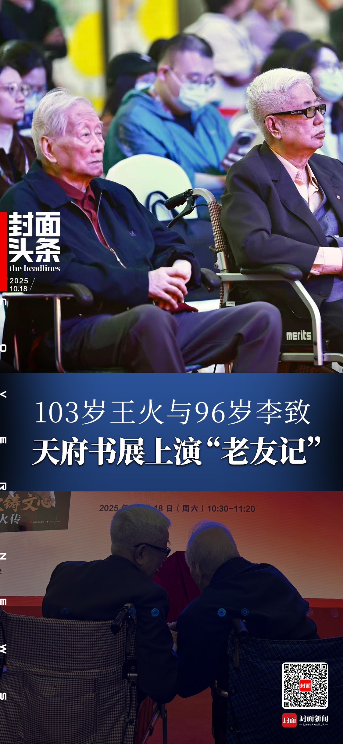 制图:李潇雪 封面新闻记者张杰吴德玉实习生朱萌丽影相报谈 10月18日上昼,一场别开生面的“知心记”在2025天府书展缓和献技。“百年火铸·文心永续——《火铸文心:王火传》新书发布会”在书展主会场举行。103岁的王火在家东谈主随同下亲临现场,96岁的李致也专程前来,两位老东谈主一碰面便牢牢捏手,四目相对,心思尽在不言中。 成齐深秋的小雨淅淅沥沥,并未赶走暖意,场馆内满盈着颠倒岁月的深情。 李致(左)、王火(右)。封面新闻记者 吴德玉 影相 103岁王火对读者充满敬意 看到马老的犬子泪如泉涌 “