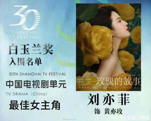 上海电视节公布,刘亦菲出演的《玫瑰的故事》,取得第30届白玉兰奖中国电视剧单位入围名单,并获最好女主角提名。