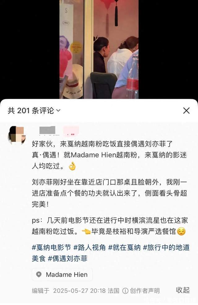 有网友晒出在戛纳偶遇刘亦菲吃越南粉的画面,此画面一出后,坐窝引起网友们平淡的见谅。