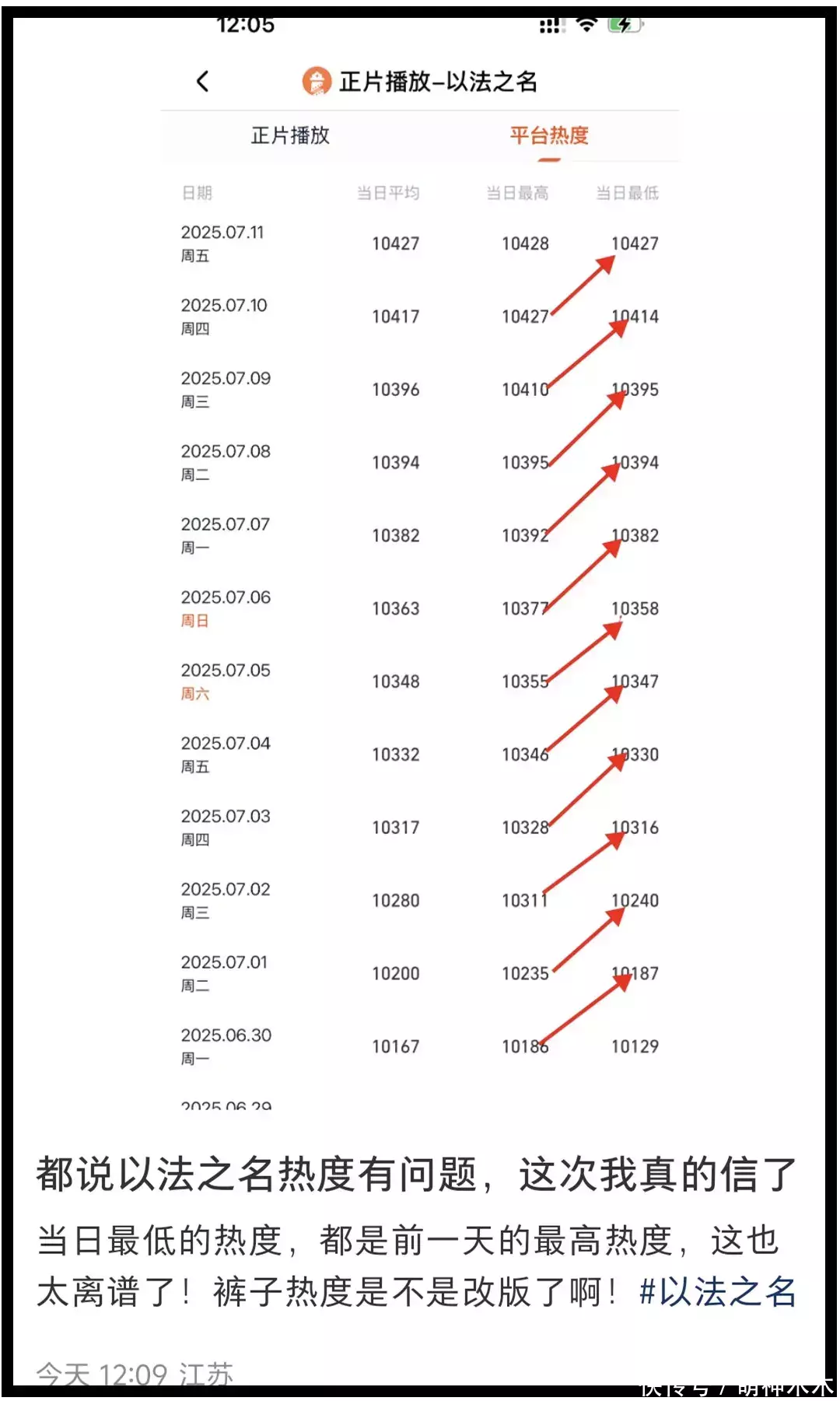 不仅如斯,网友还发现,《以法之名》过往平台热度涨幅相通奇怪,本日最低热度王人和前一天最高热度差未几,近期剧集惟有《以法之名》止境,轨则到让东说念主以为平台挑升为他们改了议论形势的地步。