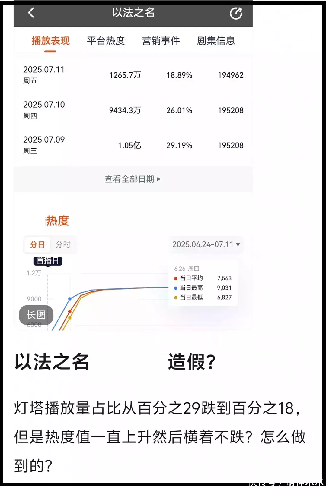悄然无息,《以法之名》烂尾风云沉默升级,不啻一位网友发现,《以法之名》平台热度和播放量占比对应不上,表面上播放量占比裁汰了,平台热度会对应下跌,但是《以法之名》莫得,全王人不合适热度高潮轨则。