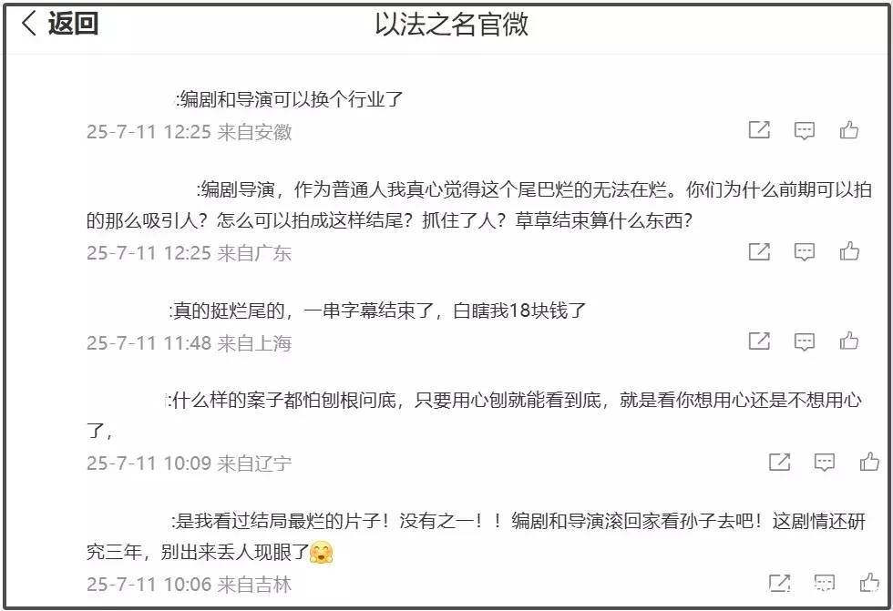 电视剧《以法之名》大结局一出,官方宣传账号的评述区王人消一火了开云kaiyun中国官方网站,就最新留言看,原因惟有一个,那等于《以法之名》澈底烂尾了。