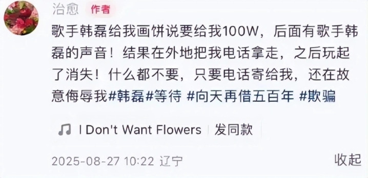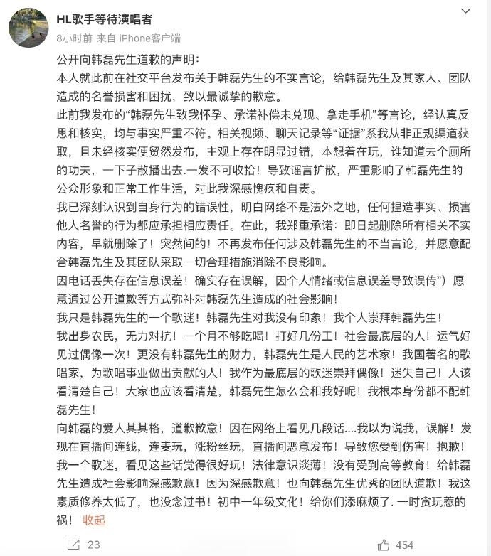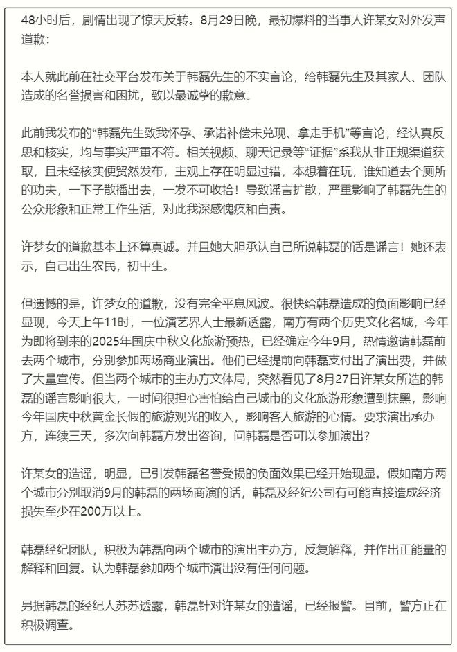 要不是韩磊最先快开云kaiyun,怕是这场“狗血剧”真就成了“家庭伦理新编脚本”。 一边是自称怀胎的女网友,晒出视频、语音、聊天记载,控诉韩磊“原意百万赔偿金却玩澌灭”;一边是韩磊夫妇火速回复,强势告状,誓将贬低者奉上法庭。 一句“我仅仅粉丝,发着玩的”,就能把一位艺术家的名誉从泥坑里拽出来? 这年初,麇集不是法外之地,可总有东谈主念念蹭着流量翻红。到底是谁在导演这场乖张戏?谁又是幕后真实的“编剧”? 第一幕:谈歉信曝光,韩磊怒拒“妥协” 8月28日,贬低者“颐养”眨眼间发布了一封“老诚”的谈
