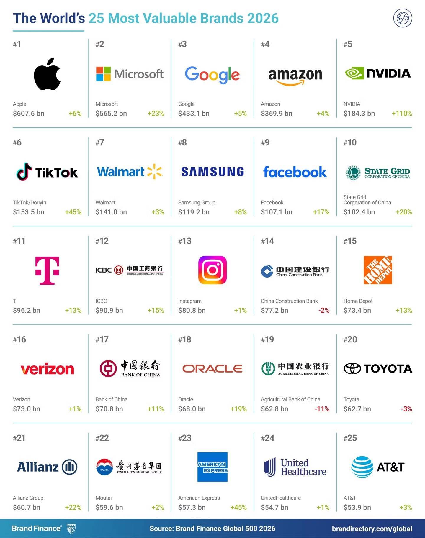 本年的榜单呈现出彰着的“科技霸权”特征,名次前四的席位未发生变化,循序为苹果、微软、谷歌和亚马逊。然则,榜单头部出现了剧烈颤动:英伟达凭借东谈主工智能波澜的鼓吹,品牌价值同比激增 109%,一举杀入前五。IT之家附上关连截图如下:
