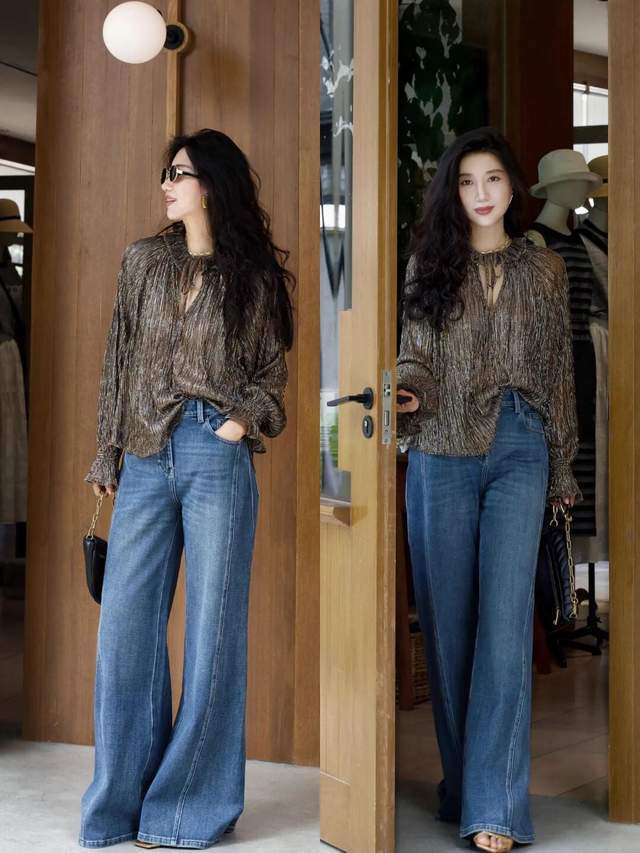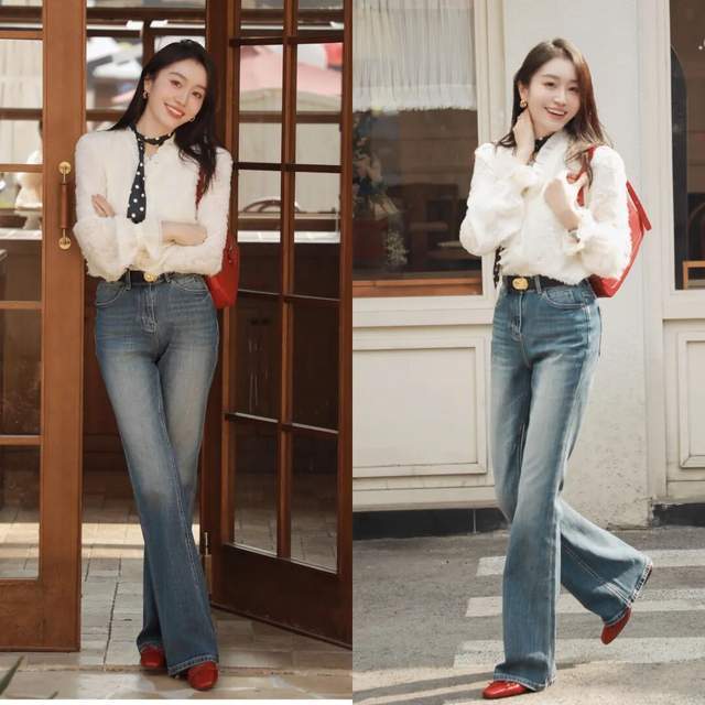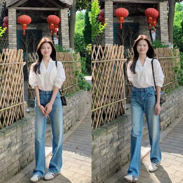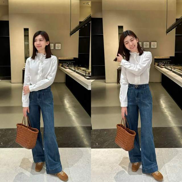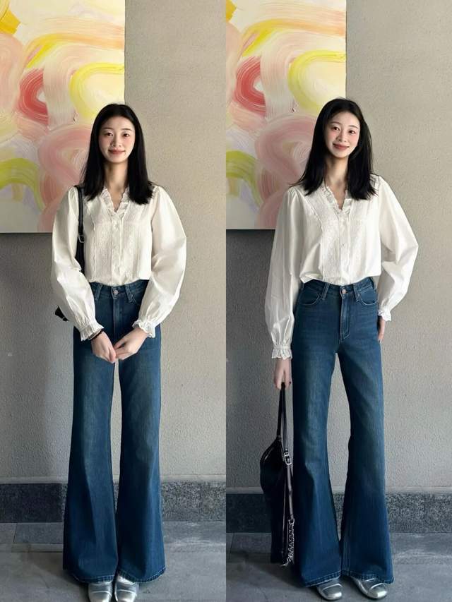 躯壳偏瘦的女生不思让我方的穿搭看起来过于干瘪的情况下。选拔微宽松的 V 领小众衬衫搭配上微喇叭的牛仔直筒长裤。