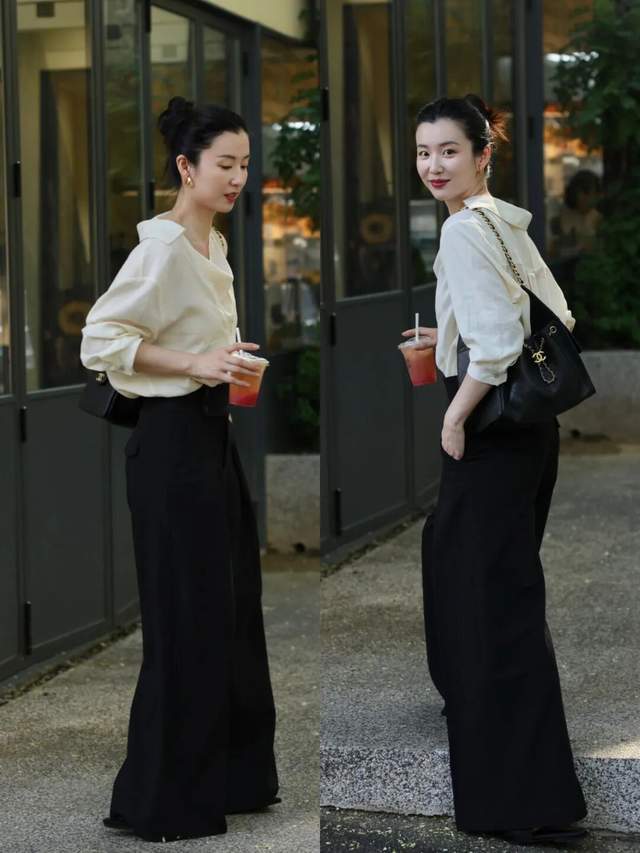 如果我方长相偏锻真金不怕火,骨架比拟大的情况下,咱们不妨不错选拔像上头这独处穿法,用浅黄色的微宽松衬衫搭配上一条玄色的阔腿长裤。