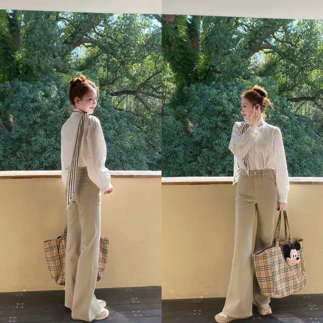 举例上头卡其色的微喇叭长裤,搭配上白色的小众衬衫,扎得高高的丸子头发型,这样的穿衣打扮确实很显利落,既显高又显瘦,不压个子,铁心拿抓,一眼心动的春日氛围。