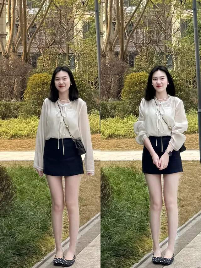 躯壳不同,年齿不同,气质不同,当然选拔的穿衣立场有一定的分辨,举例上头这位 00 后的好意思青娥,就用了一件薄纱的小众衬衫内搭小吊带,采集一条玄色的 A 字短裙。