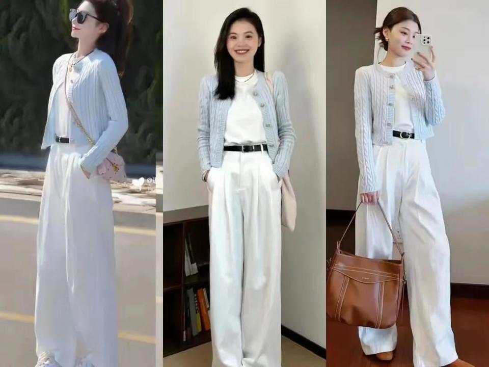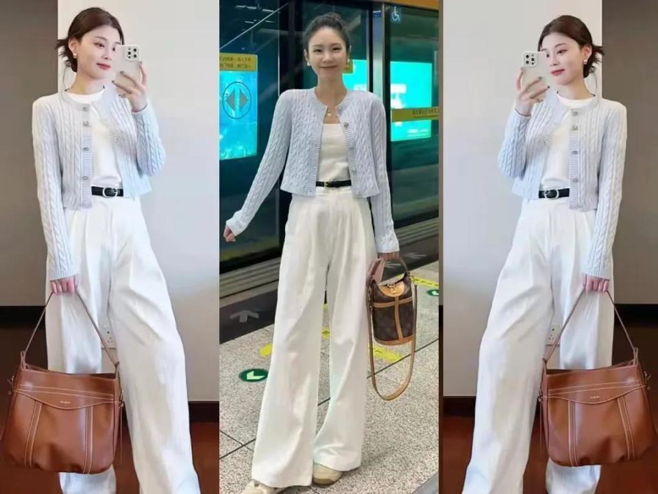 小个子女生,我们还不错接收上短下长的搭配款式,短款的诚挚开衫搭配上一件白T恤和一条白色的直筒长裤,短款的诚挚开衫上衣照实能更好的栽植腰线,格外符合小个子女生穿的。